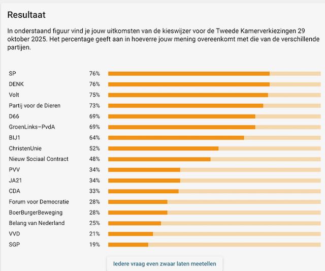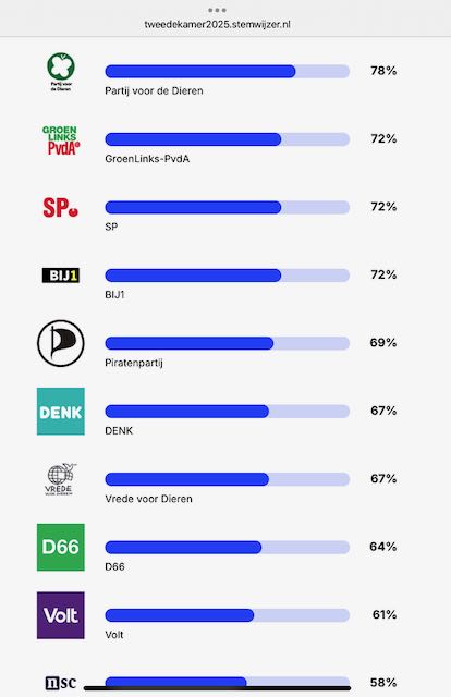 Dat GL-PvdA hier pas op de 6e plaats komt, na Denk, D66 en Volt verbaast mij ook enigszins. Maar goed, dit is het resultaat van de Kieswijzer. De Stemwijzer toont een realistischer beeld, al zal de Partij voor de Dieren niet snel mijn stem krijgen, net zo min als Denk of BIJ1. Dat ligt vooral aan het ‘identitaristische karakter’ van deze partijen. Ik hou van dieren maar zal nooit op ze stemmen, al weet ik ook wel dat de PvdD inmiddels een bredere ‘scope’ heeft dan bij haar oprichting. Wie het milieu op één zet, kan zomaar bij deze club uitkomen.